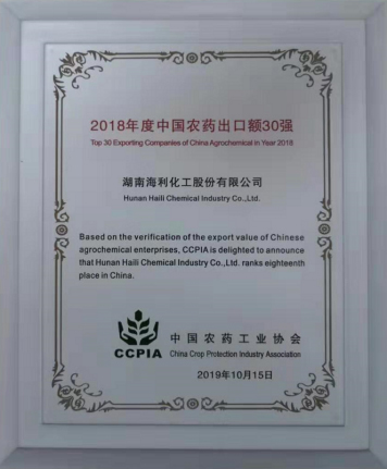 金秋收獲季,碩果采摘時(shí)。日前,在上海召開(kāi)的第十九屆全國(guó)農(nóng)藥交流會(huì)上傳來(lái)喜訊,隨著2018年度中國(guó)農(nóng)藥出口額30強(qiáng)出爐,海利集團(tuán)旗下湖南海利化工股份有限公司以第18順位閃亮?xí)x榜。